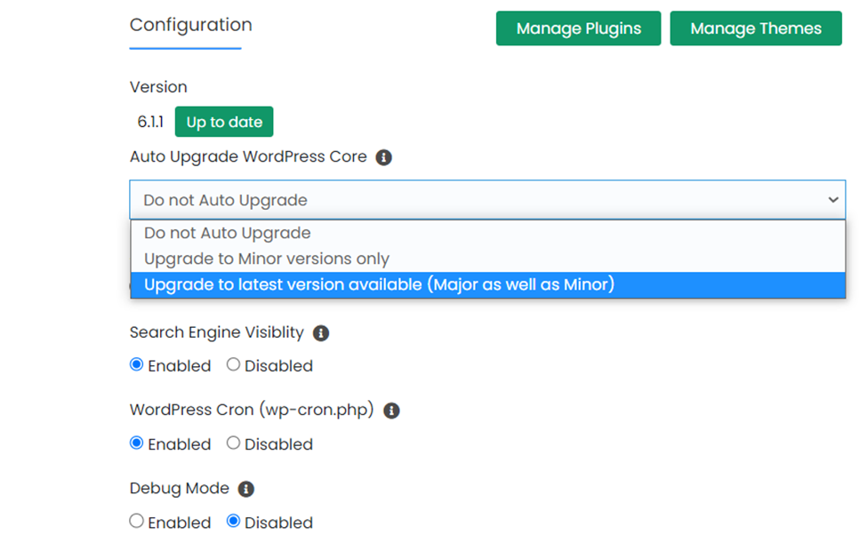 WordPress lanza actualizaciones periódicas que abordan problemas de seguridad y vulnerabilidades conocidas. Asegúrate de actualizar tanto el núcleo de WordPress como los plugins y temas que estés utilizando. Para facilitar el proceso, activa la opción de actualización automática en el panel de control de WordPress o utiliza herramientas como WordPress Manager By Softaculous para activar la opción de actualización automática del núcleo de WordPress.