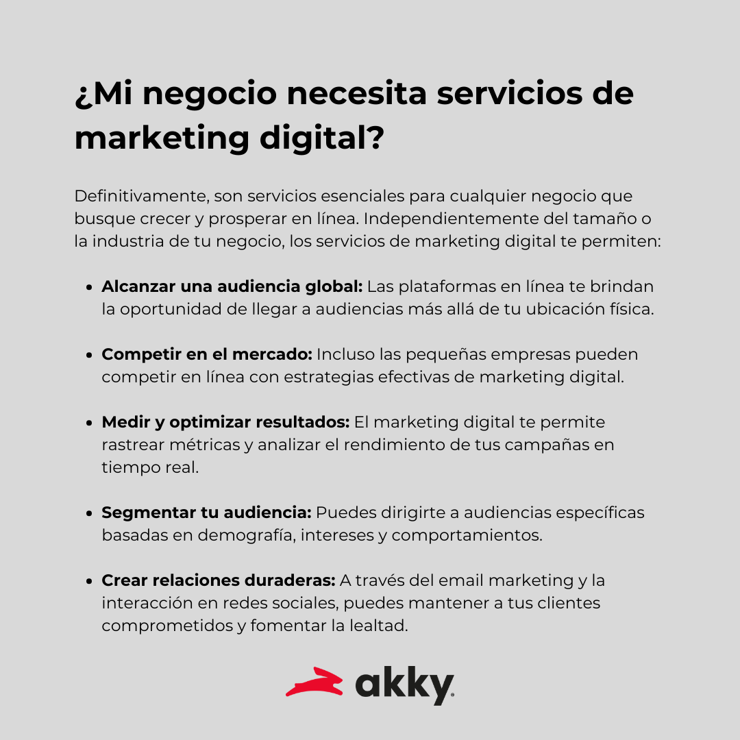 En Akky, comprendemos la magnitud del marketing digital y su impacto en los negocios dentro de Internet. Te recordamos que nuestros servicios abarcan desde el branding hasta kits de redes sociales y guías para anuncios. Nuestro objetivo es potenciar tu presencia en línea y llevar tu negocio al siguiente nivel en el mundo digital. ¡Conviértete en el líder de tu industria con Akky!